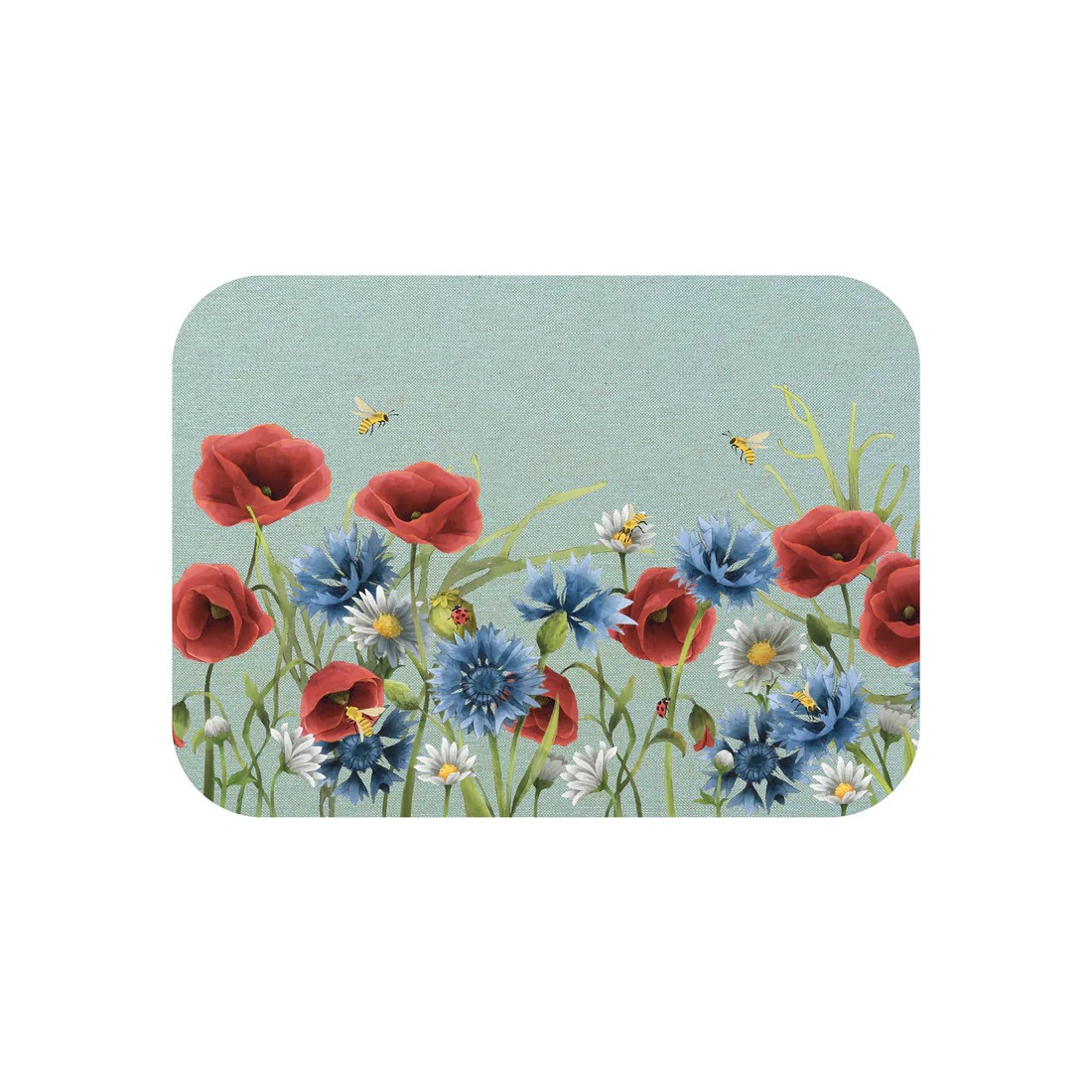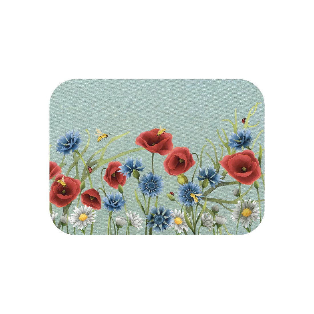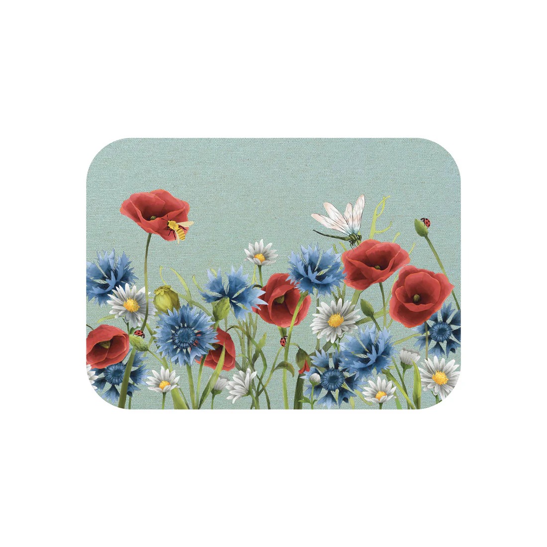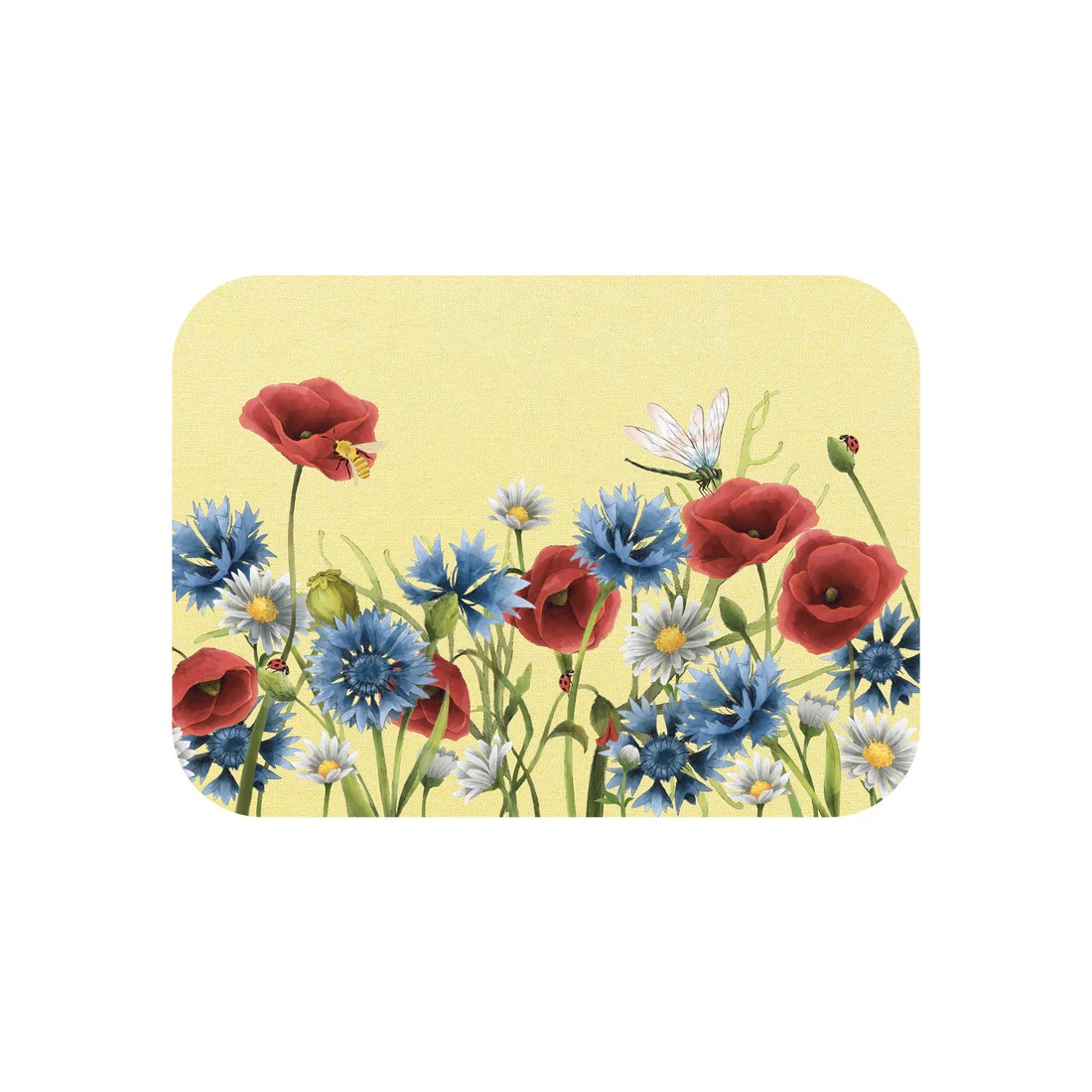 Placemat made of wood fibre, natural cork, printed cotton fabric in two different backgrounds in yellow and light blue, depicting poppies, daisies and cornflowers, digitally hand-drawn by us.